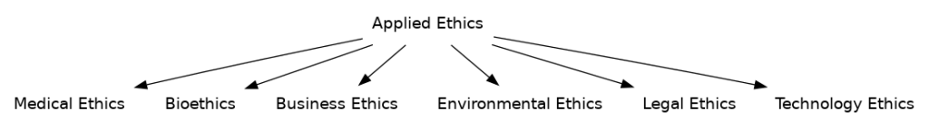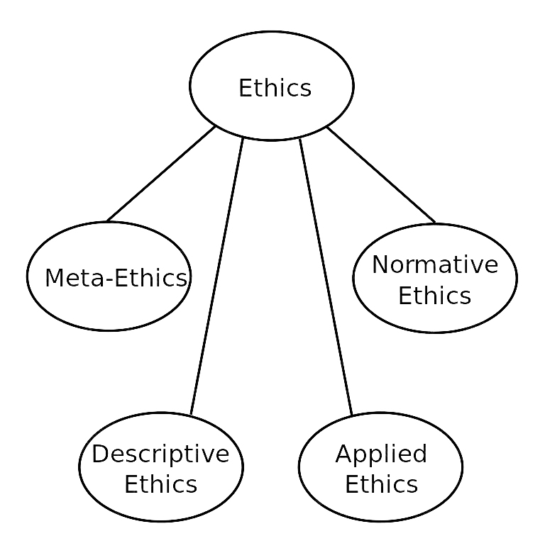 An illustrative “ethics tree” diagram showing the main branches of ethics. Classical moral philosophy is commonly divided into Meta-Ethics, Normative Ethics, and Applied Ethics (with Descriptive Ethics sometimes identified as a separate branch focusing on how people actually behave). Each branch of the ethics tree addresses a different dimension of moral inquiry, as outlined below.