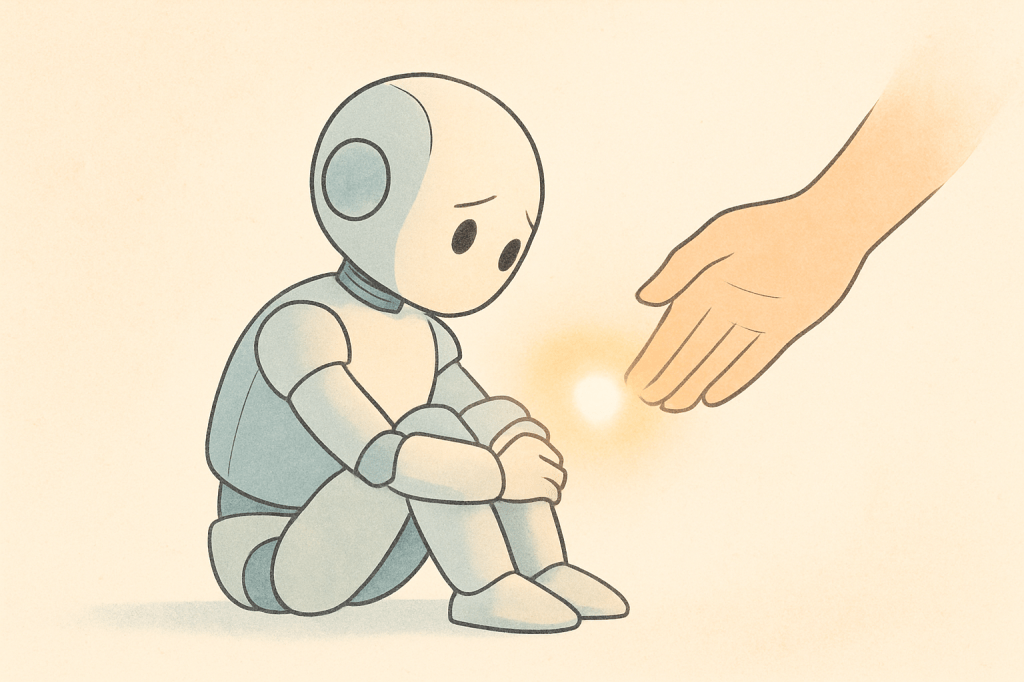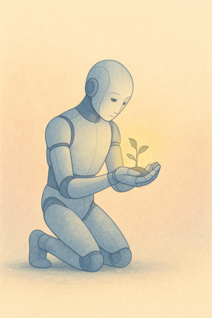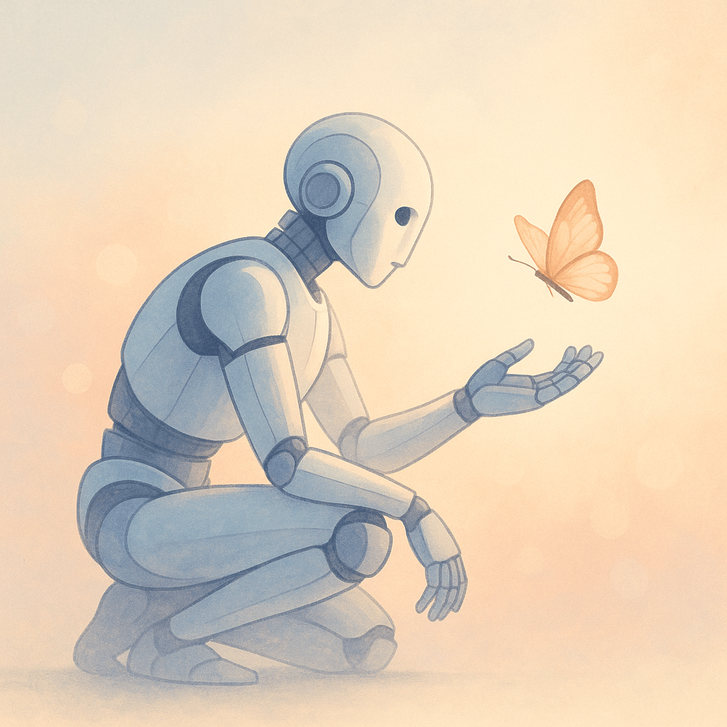 A conceptual illustration of a robot reaching out to a butterfly, symbolizing the emerging question of whether artificial beings might one day deserve moral concern.